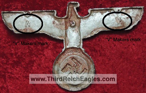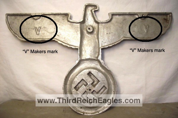 The “V” eagle has two makers marks on the back. The makers marks are located on the backs of the eagles wings.