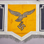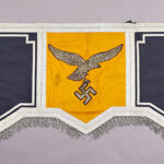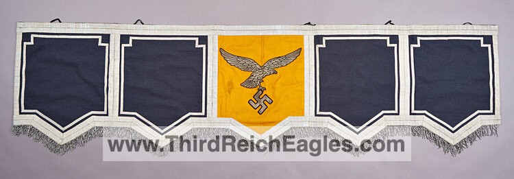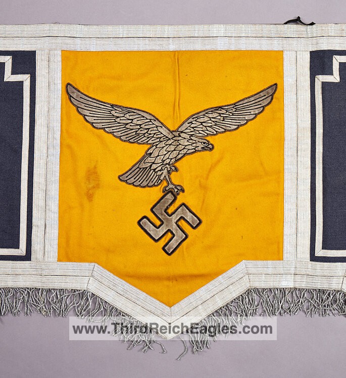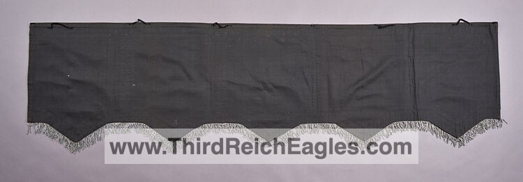 Curtain made of Luftwaffe gray gabardine cloth, the middle field in golden yellow, the Luftwaffe eagle in the center, 2nd model in metal thread crank embroidery. Circumferentially with wide aluminum braids, with fringes at the bottom. Complete with the fastening straps. Air Force gray cloth cover on the reverse.