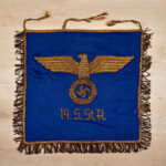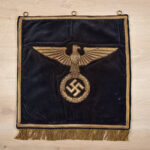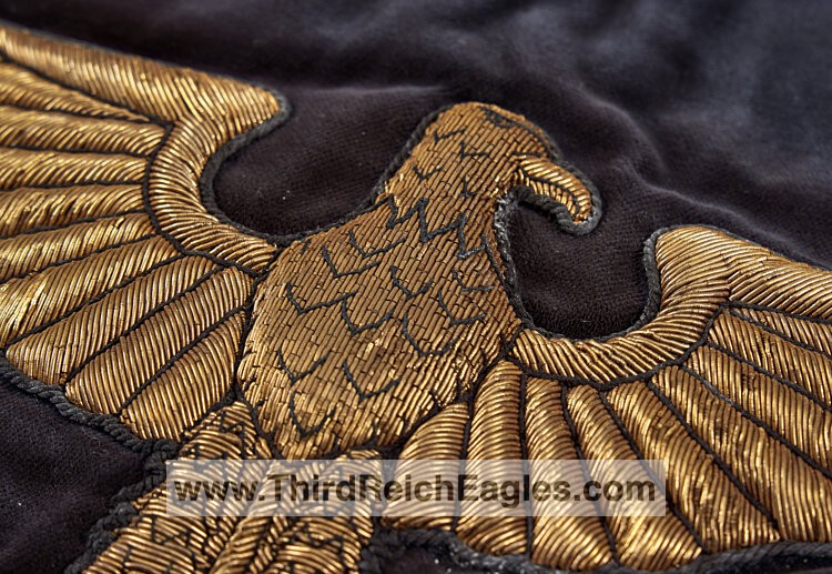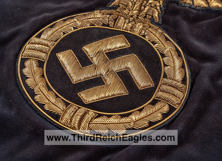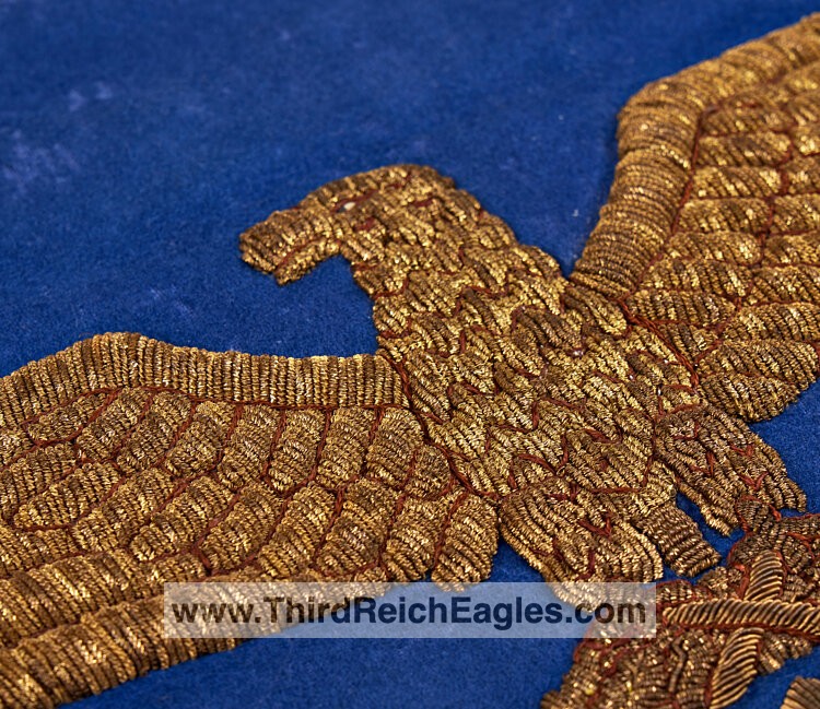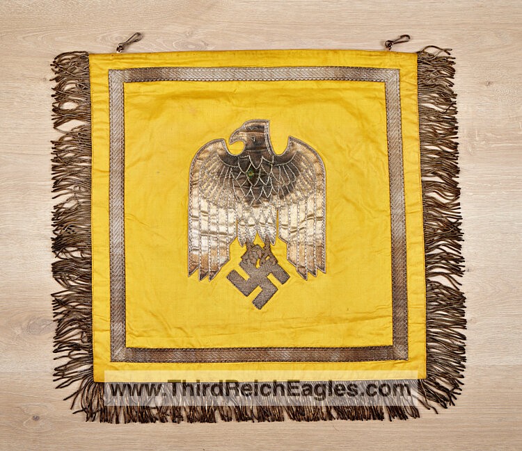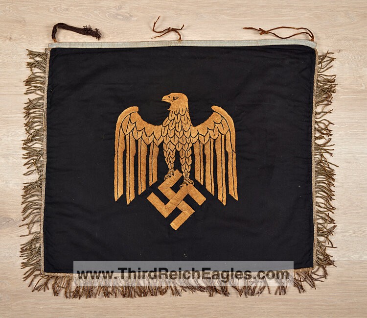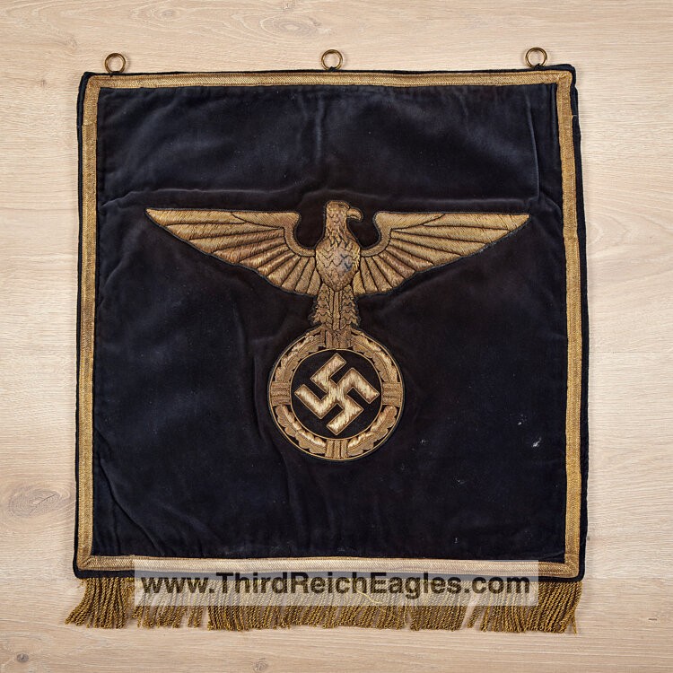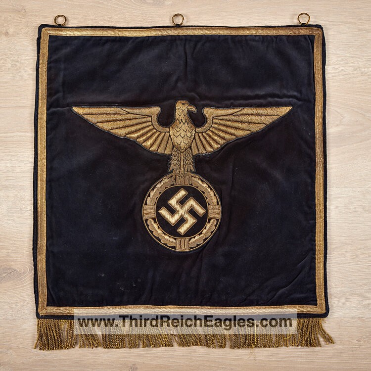 Blue velvet embroidered on both sides with NSDAP national eagle in particularly fine, plastic embroidery quality made of silver-plated metal threads. Four-sided silver embroidered border, the underside with fringes. Eyelets sewn on the upper edge.