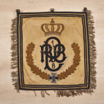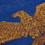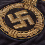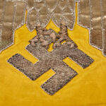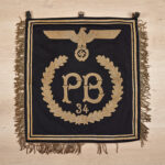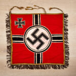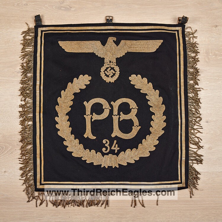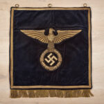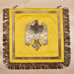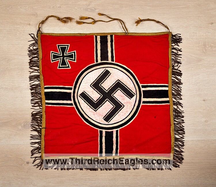 The front with gold-embroidered navy national eagle in gold-plated metal thread embroidery on a blue cloth backing. Underneath the embroidered inscription: “14. S. St. A.” (14th Ship – Trunk – Division). The back in the form of the imperial war flag in the finest embroidery quality. Three-sided golden fringed hanging made of gilded metal threads with gold edging. Attachment loops at the upper end. Banner of the Kriegsmarine.