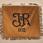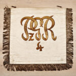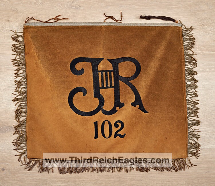 The front with hand-embroidered Wehrmacht national eagle made of white and black wool threads on a black cloth base, The regimental emblem “J III R / 102” embroidered in black wool threads on a sand- colored background on the reverse . Three-sided fringes made of silver-plated metal threads and braided metal threads on all sides. Attachment loops at the top.