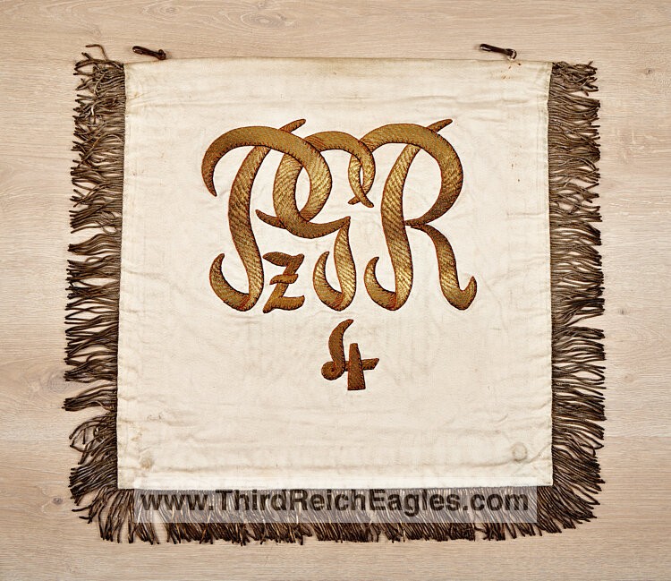 The front made of yellow cloth with an embroidered Wehrmacht national eagle in silver-plated metal thread embroidery. Border made of metal thread mesh. The back with a regimental cipher made of gold-plated metal threads: “PZGR 4” on a white cloth backing. Three-sided silver-plated fringe hanging. Metal rod with fastening eyelets sewn into the top.