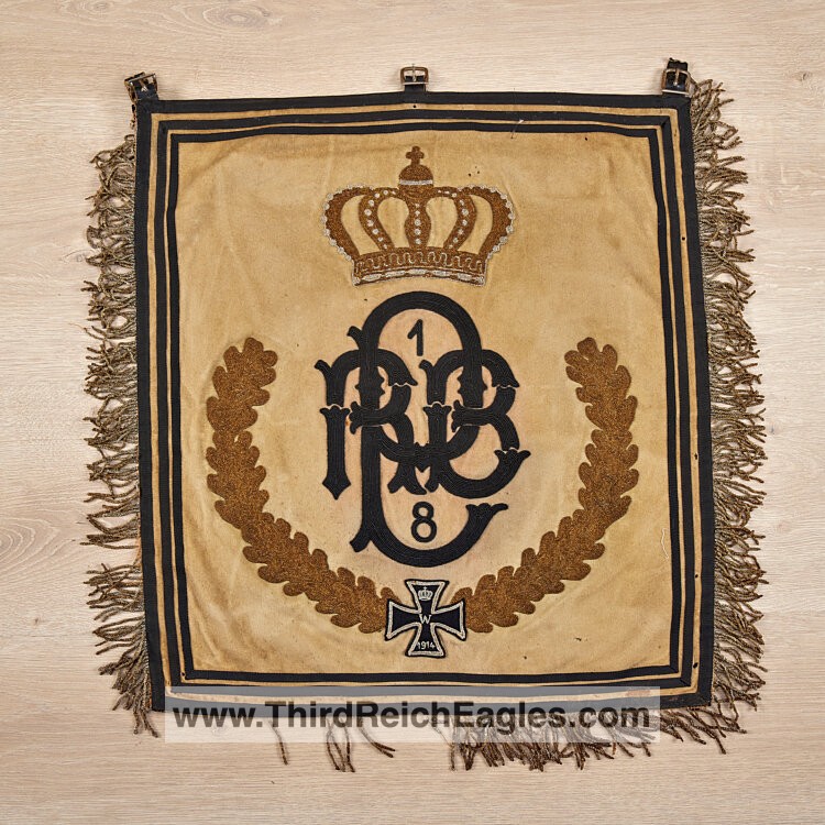 On the front, in the finest silver thread embroidery on a black cloth underlay, the army national eagle and the emblem “PB 34” (pioneer battalion 34) within an oak wreath. The back with the traditional emblem of the 1st Rhenish Engineer Battalion No. 8 , within an oak wreath with the Iron Cross 1914. Above it the Prussian royal crown. Finest gilded metal thread embroidery on white cloth underlay.