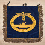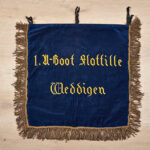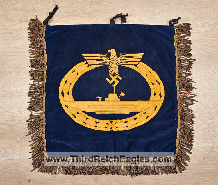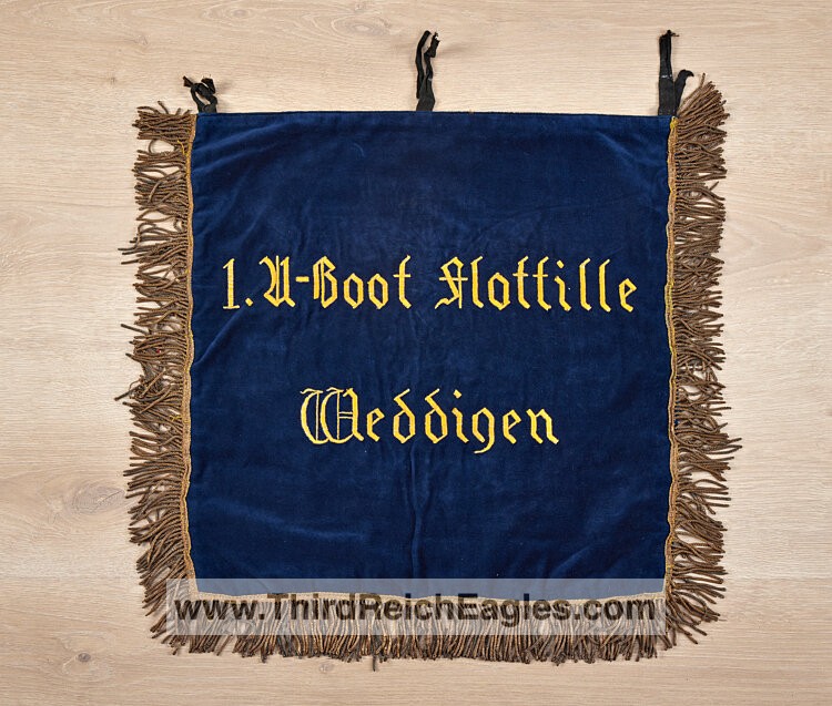 On the front the embroidered designation in Fraktur script: “1. U-Boot Flotille / Weddingen. Yellow wool thread embroidery on a blue velvet base. The back with large embroidered submarine war badge on a blue velvet backing. Three-sided golden fringed hanging made of gilded metal threads. Attachment loops at the upper end. Particularly beautiful trumpet banner of the German submarine weapon of great rarity.