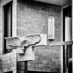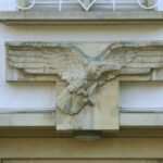 A modern work of art by an American Martha Rosler. She conceived an entire installation in different places of the city called “Unsettling the Fragments”. The “eagle” fragment exists outside the entrance to the Münster Arcades. The eagle at the Arcades is a replica, but the original can still be seen today at the former Lufttransportkommando (air force transport command) of the Wehrmacht (now the Bundeswehr), which was established in 1935 under the direction of Ernst Sagebiel. However, the swastika that the eagle was holding in its claws was chiseled off after 1945 – its picture can be seen above.