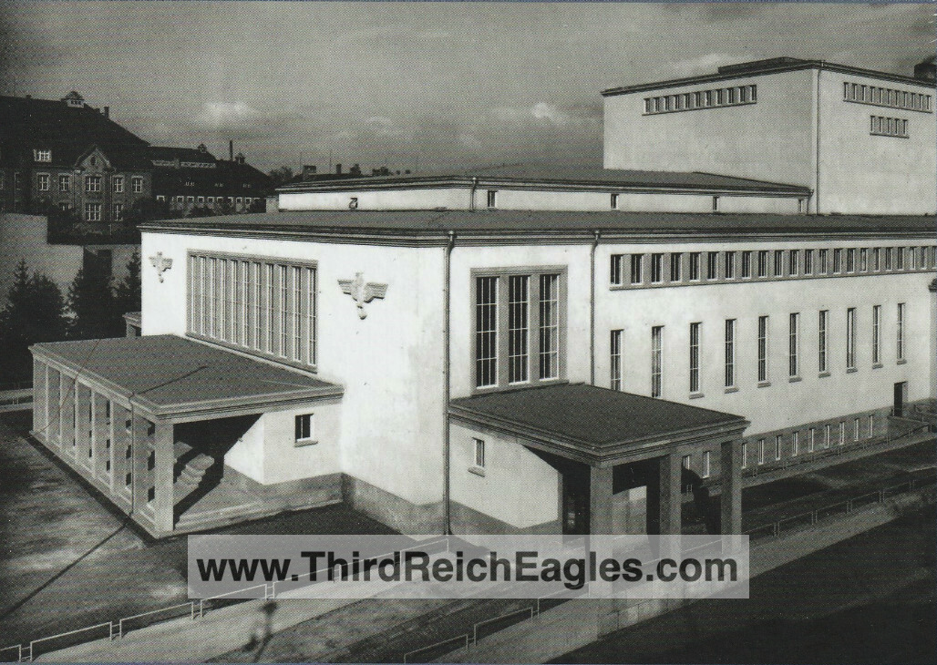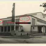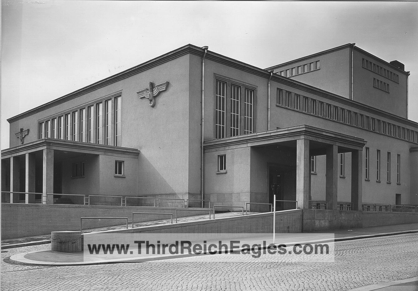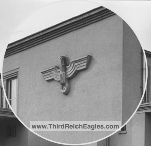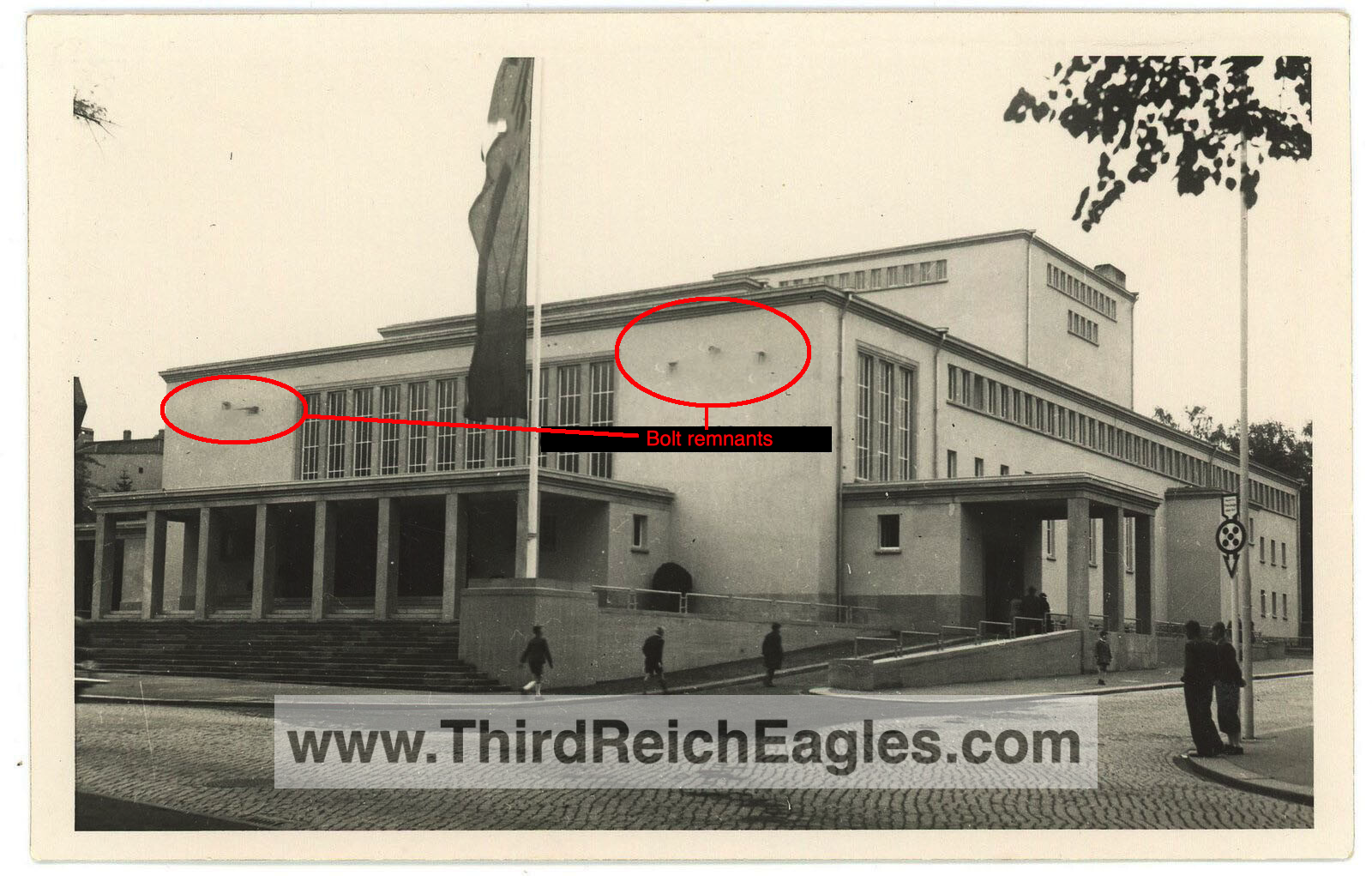 There were originally 2 large concrete or stone eagles attached to the facade that were removed post 1945. The images below show the before and after as well as some remnants of the eagles just after removal.