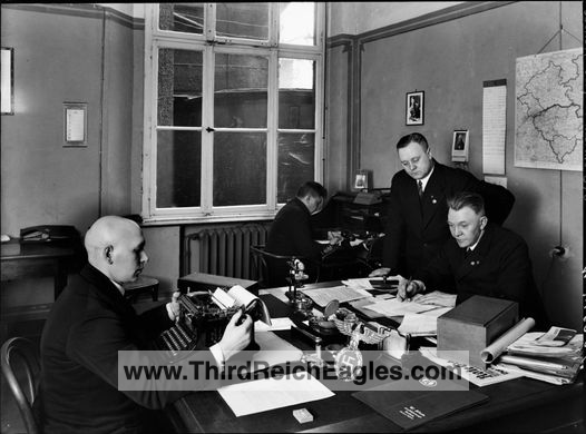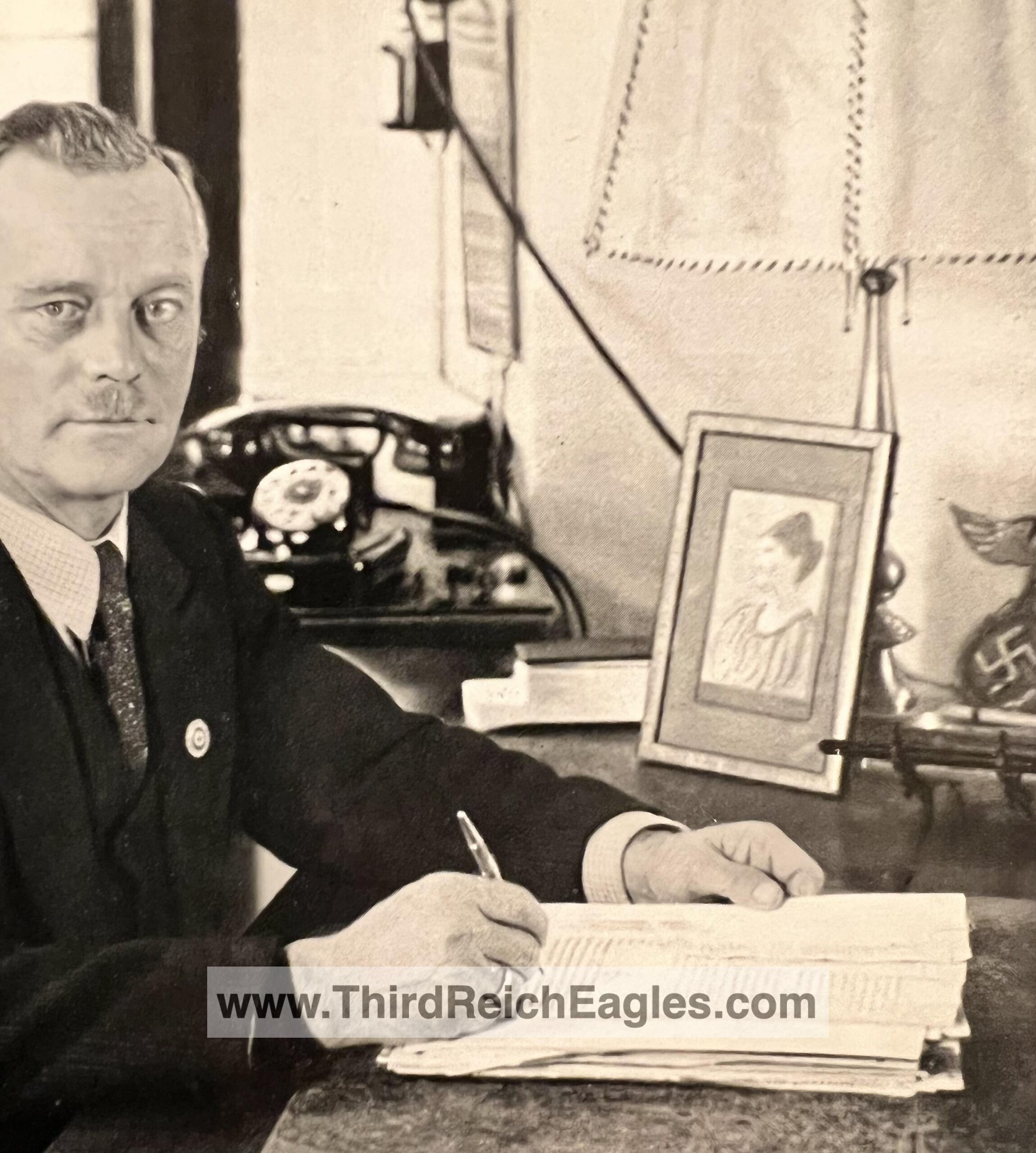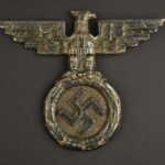 This desk eagle with stand comes in several different styles. There are no known period photographs. It has been speculated that these were used in recruiting offices on the desk or that they were associated with NSDAP newspaper operations – as weights on top of the papers. Some of these are the most heavily reproduced eagles to be found. They come in several different materials.