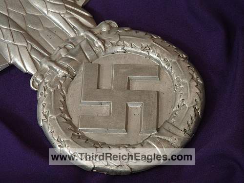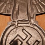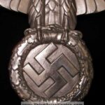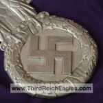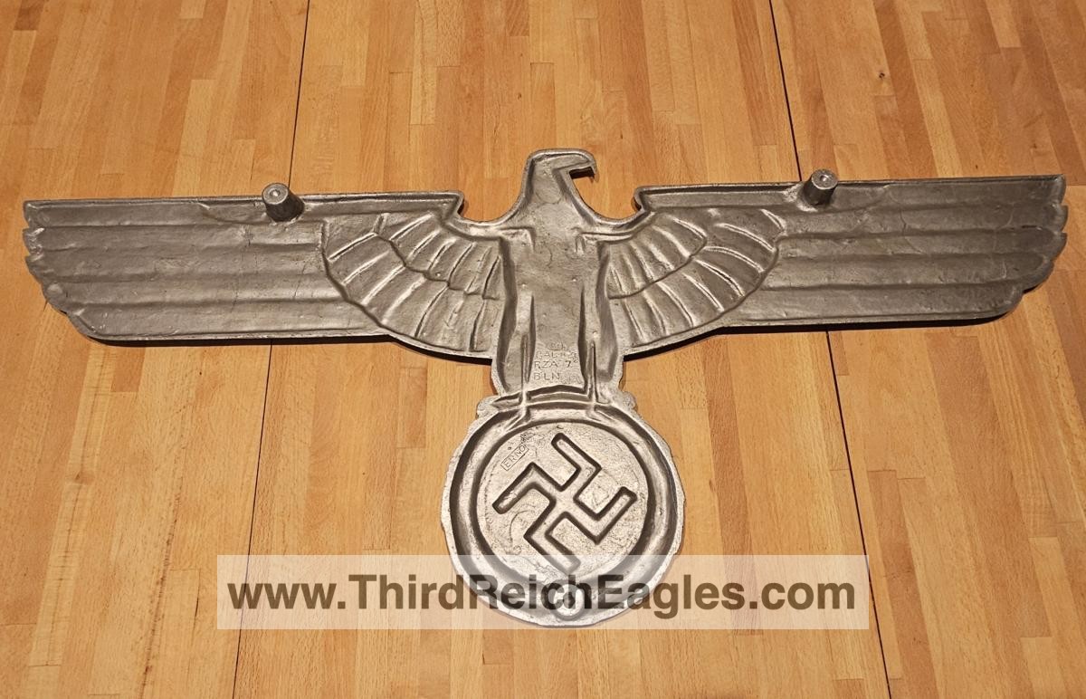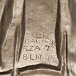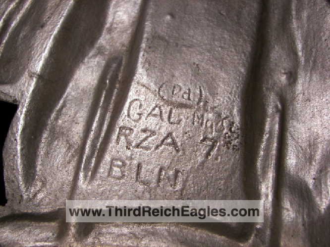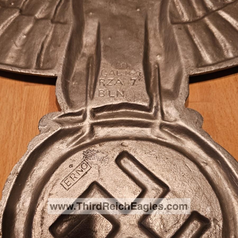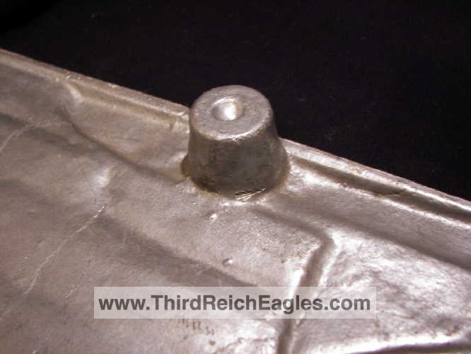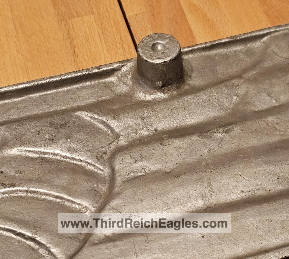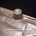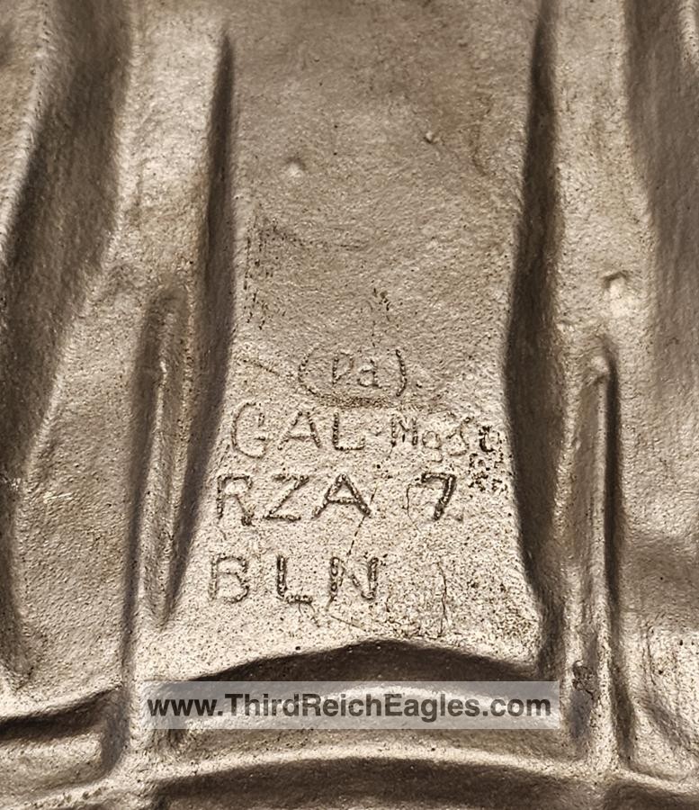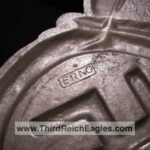 This maker has the letters “ERNO” encased in a rectangle located above the top left hand of the swastika (on the back). The known examples are 900mm (35″). Very few examples of this maker are found and little is known of them. On the body of the known examples there is the following markings: Pd – the chemical element symbol for Palladium. Palladium is part of the Platinum group of metals. Though quite expensive and rare today, Palladium was not viewed as such 75 years ago. The Germans used it in the processing of camera film. Both Platinum and Palladium enhances the appearance to be more silvery and brighter, hence the reason that it is used today in manufacturing expensive jewellery.), GAL Mg Si (material designation), RZA 7, BLN. On one example the studs are conical and have a screw hole in the top, whereas the other one has the normal threaded bolts. The non-threaded example appears to have been painted and shows signs common with many reproductions.