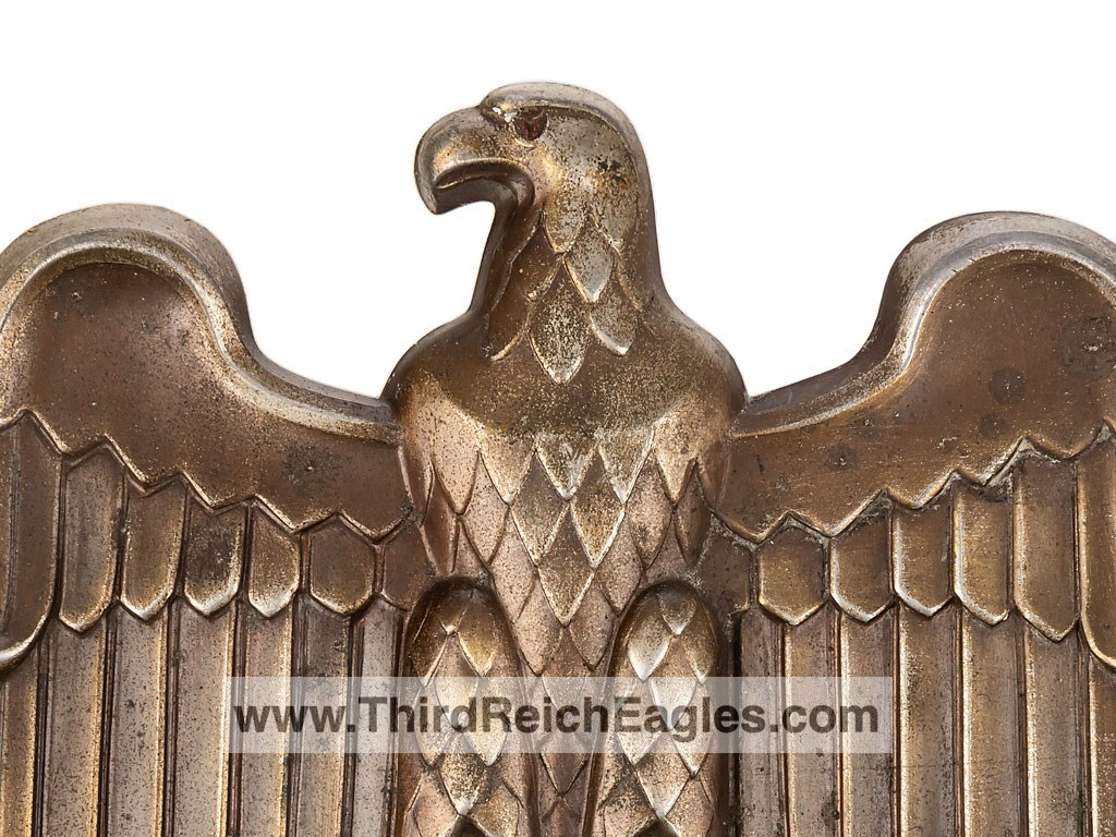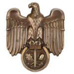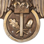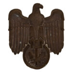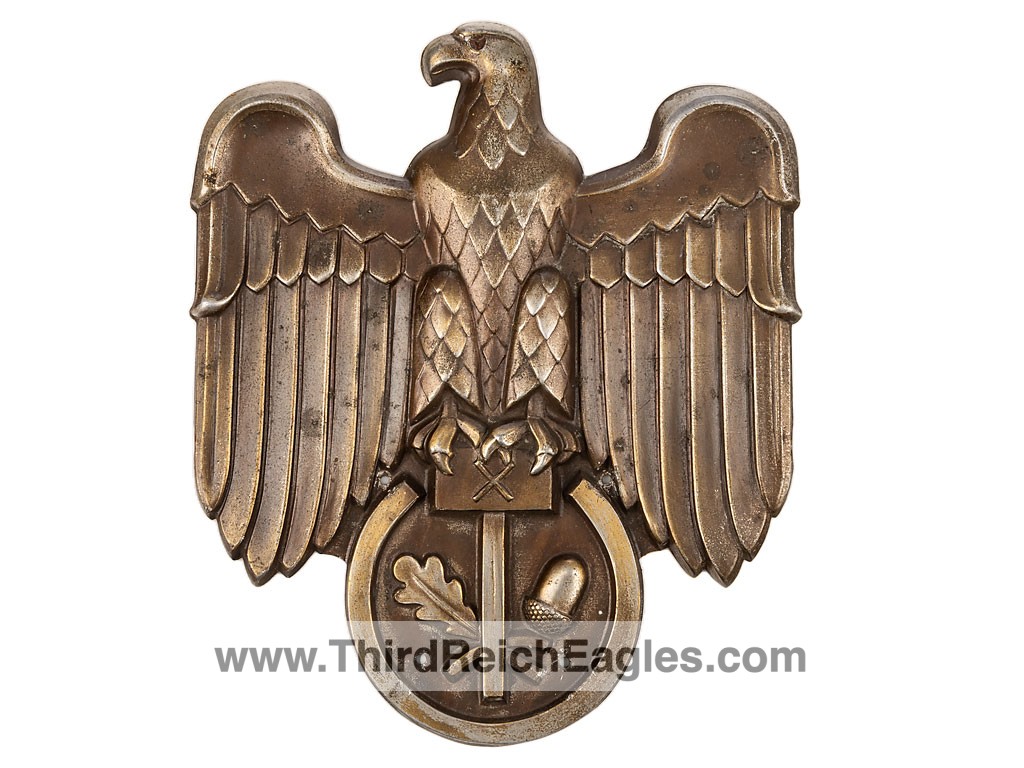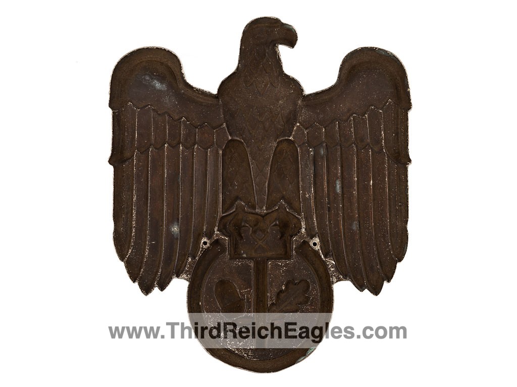 The Association was created around 1934 and represented independent artisans and makers, in order to protect their brands. As with all associations it fell under the National Socialist control, but surprisingly, does not support the ubiquitous swastika. The symbol of the association is the Hammer with the oakleaf andacorn. It’s only concession to the Nazi regime is the inclusion of the Eagle. The plaque is die stamped out of an aluminium alloy and is finished in a bronze anodised surface. The eagle plaque has 4 small holes for screwing it to a flat surface.