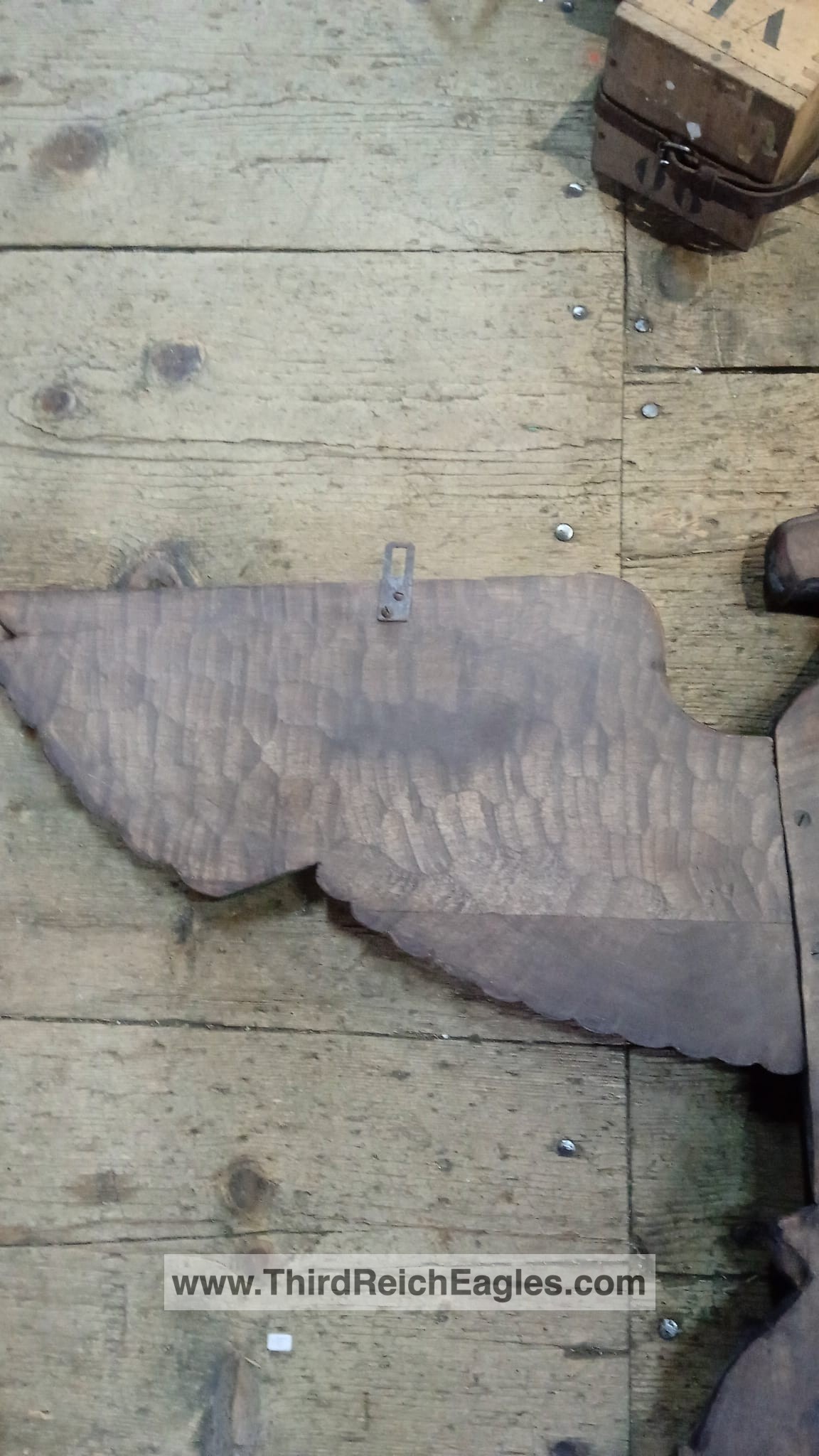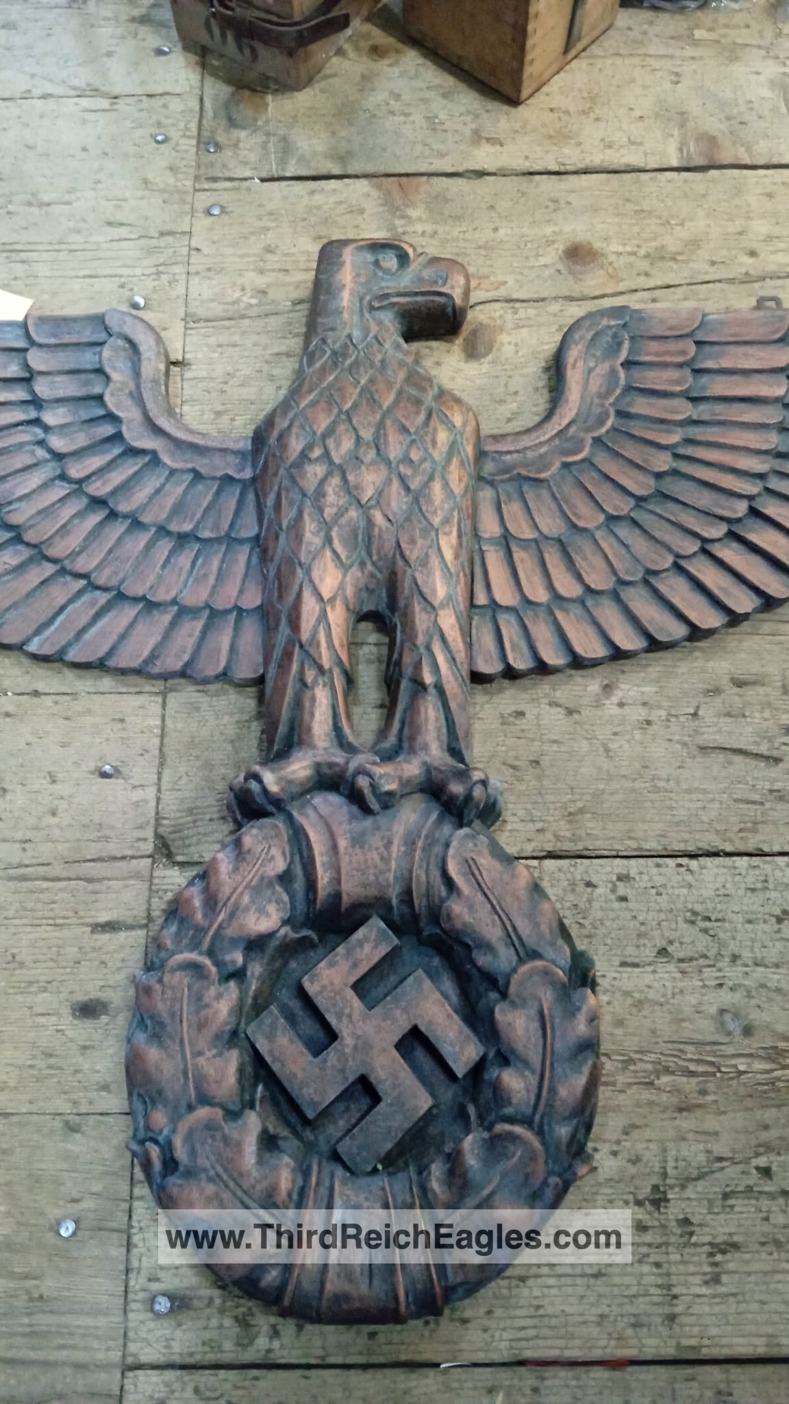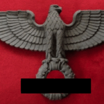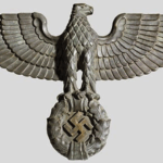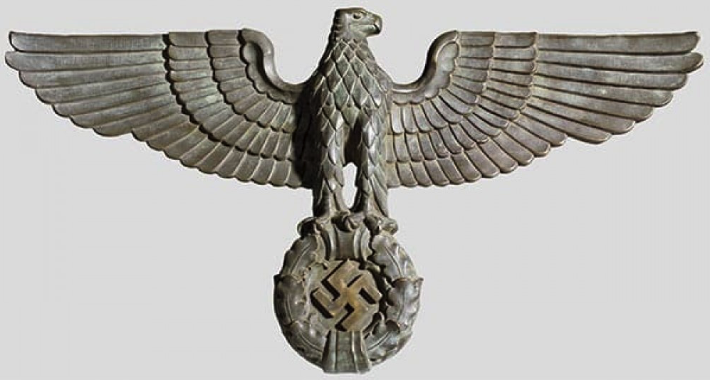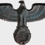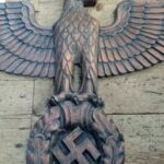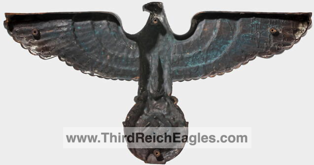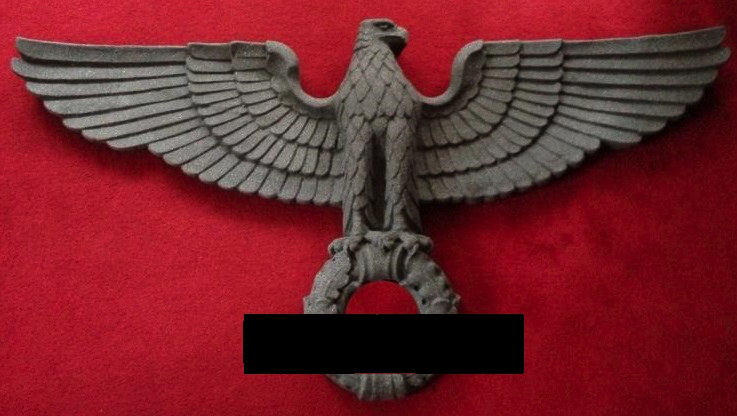 This style of eagle originates from a Kurt Schmid-Ehmen design – more details here. The below eagle is a Bronze example with the Artist’s signature “Schmid-Ehmen. München” on the left wing. The wall eagle is 53.5cm High by 102cm wide. It is possible the solid metal (silver appearance) example above may have been made under licence from the original design below. The bronze KSE eagle below was auctioned at Hermann Historica Auction #49 (Photos courtesy of Hermann Historica)