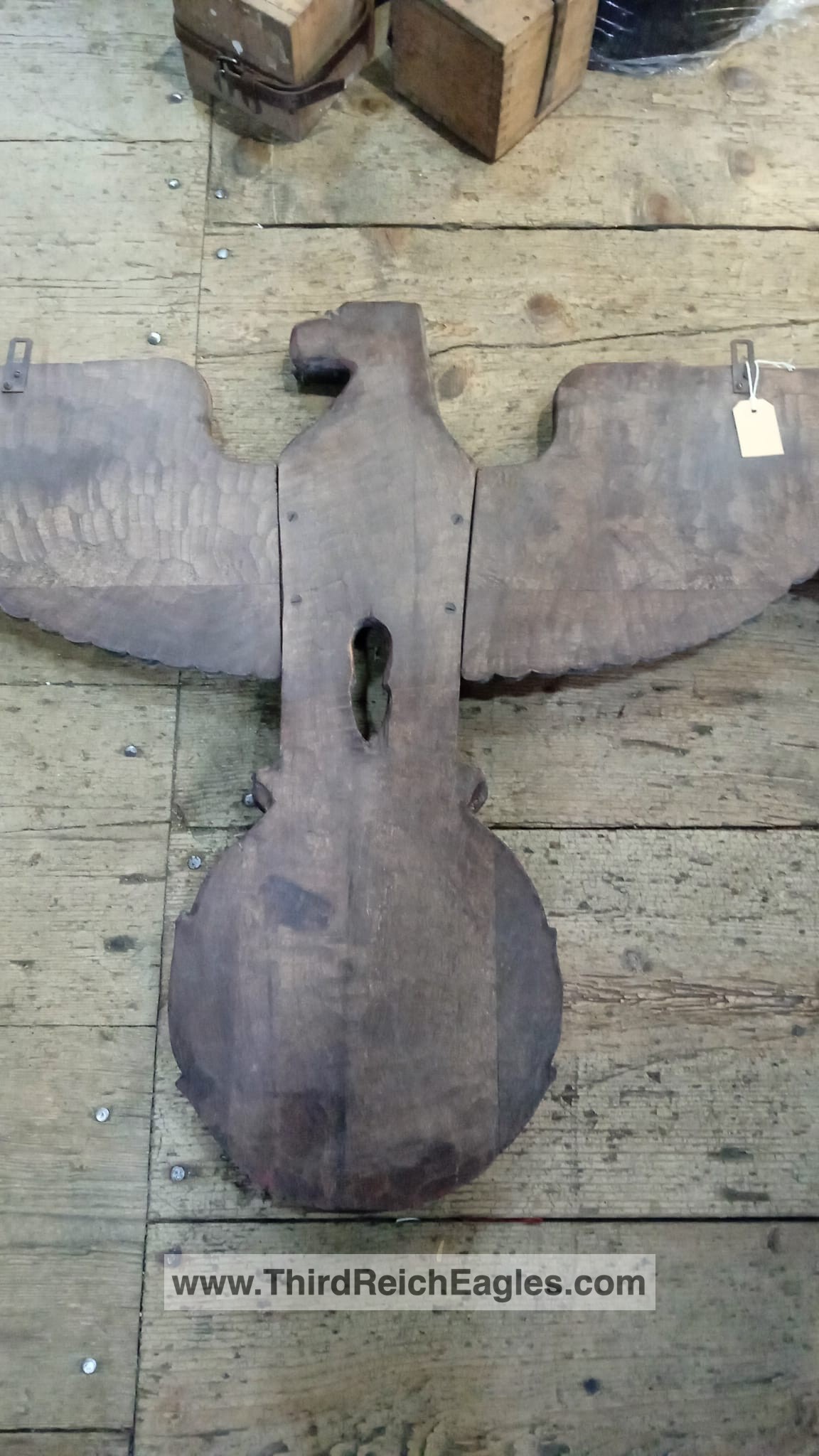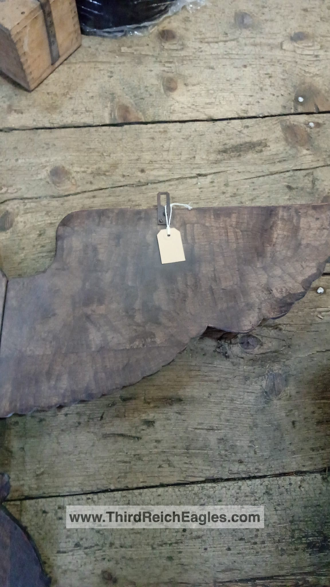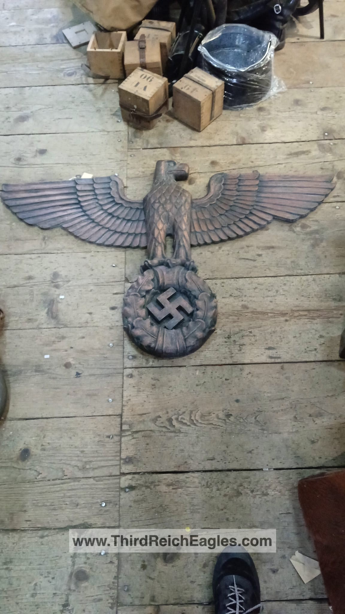 This style of eagle originates from a Kurt Schmid-Ehmen design – more details here. The below eagle is a Bronze example with the Artist’s signature “Schmid-Ehmen. München” on the left wing. The wall eagle is 53.5cm High by 102cm wide. It is possible the solid metal (silver appearance) example above may have been made under licence from the original design below. The bronze KSE eagle below was auctioned at Hermann Historica Auction #49 (Photos courtesy of Hermann Historica)