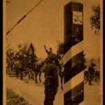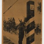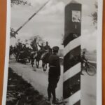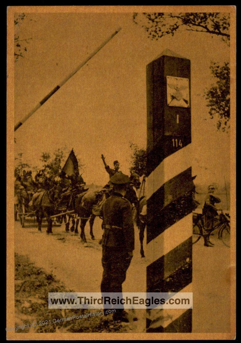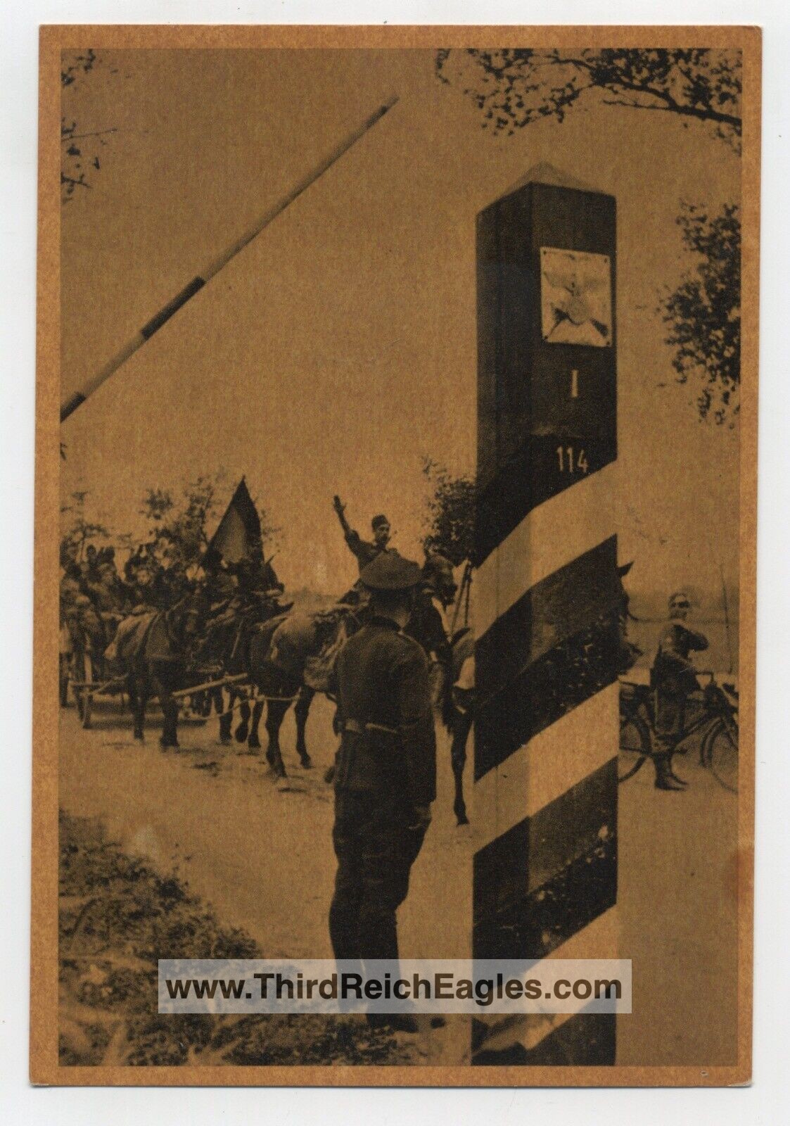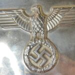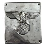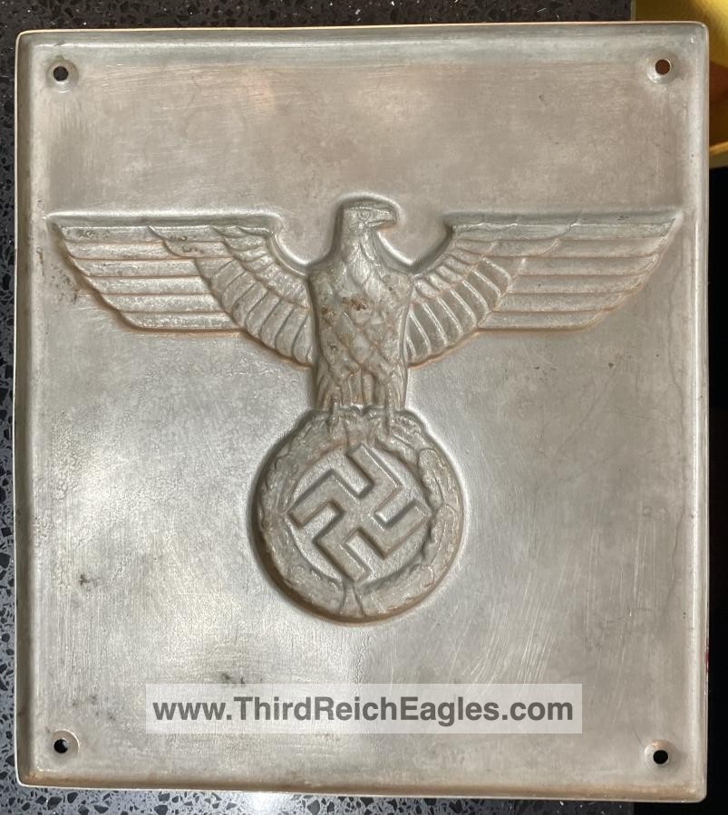 Third Reich border marker plaque. These plaques were mounted on painted wooden posts and located on the borders of Nazi Germany and its surrounding neighbors. This style of border plaque has been used in European countries for some time and modern equivalents exist today. The Third Reich version is made of Aluminum and has an externally raised national eagle with a swastika. The plaque is attached by four mounting points to the vertical wooden post and is a rare collectors item with few examples remaining.