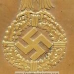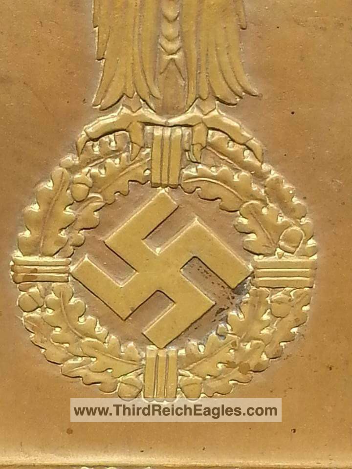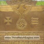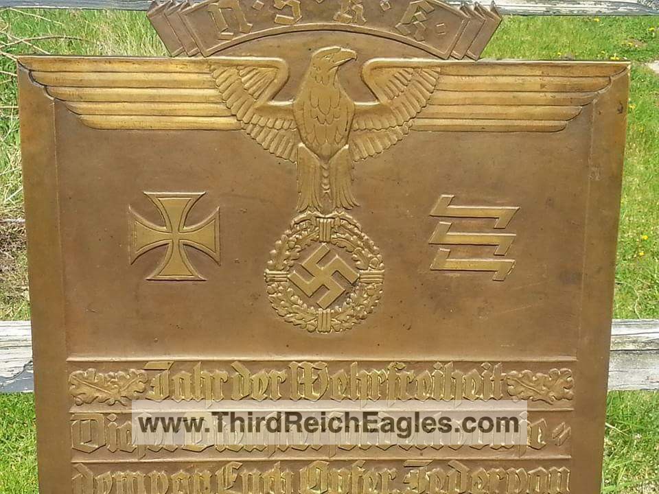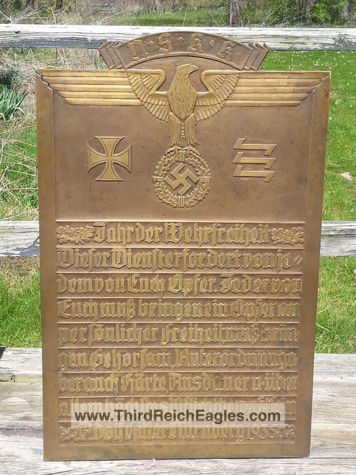 This bronze plaque is titled Year of Military Liberty. It contains a quote from Hitlers speech in 1935 where he intends to dump the Versailles Treaty and Re-arm Germany. NSKK is the commissioning source.