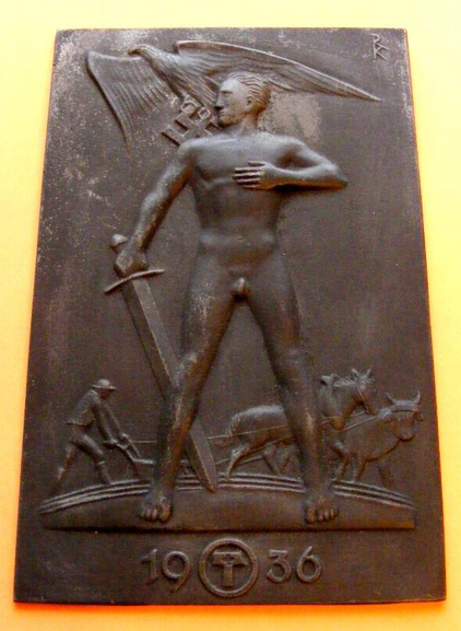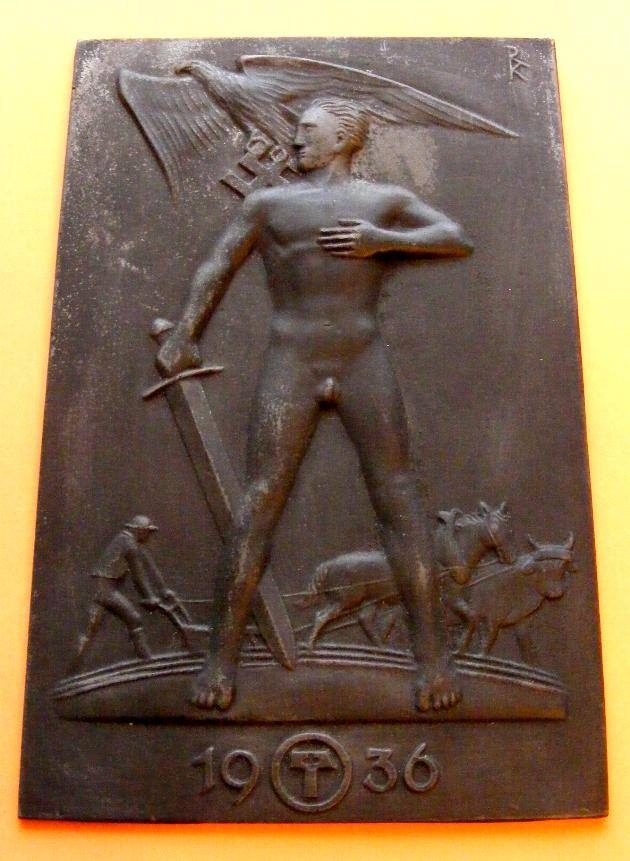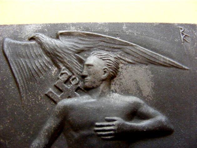 Another cast iron wall plaque, this one manufactured in 1936 by the foundry Lauchhammer with the designer’s initials at the top right – in this case noted German artist Richard Klein. Richard Klein (born 7th January, 1890 in Munich; & died 31st July 1967 in Weßling) was a German painter, sculptor, graphic artist and Medal designer. From 1935 he was a manager of the state school for applied arts in Munich and was an important artist for the German National-Socialist regime designing many medals and badges – most notably for the yearly Reichparteitag celebrations.