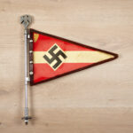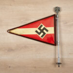 HJ flag with a sewn-on field with a swastika. Original plastic case with brown leather edging. Snaps on the barside. Remnants of an RZM paper label on the back of the pennant. Plastic cover with crack on the back.