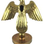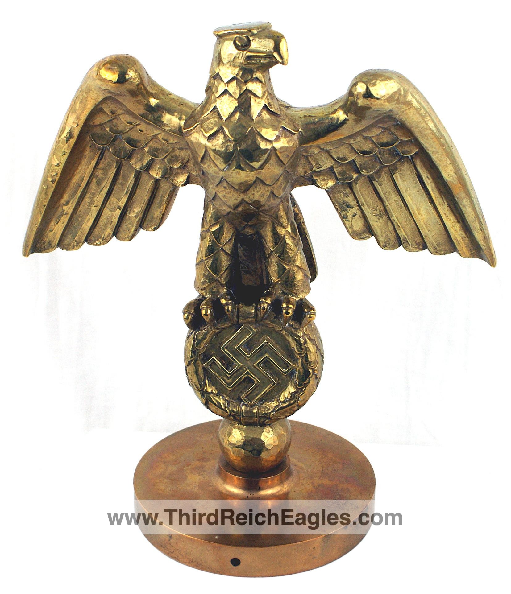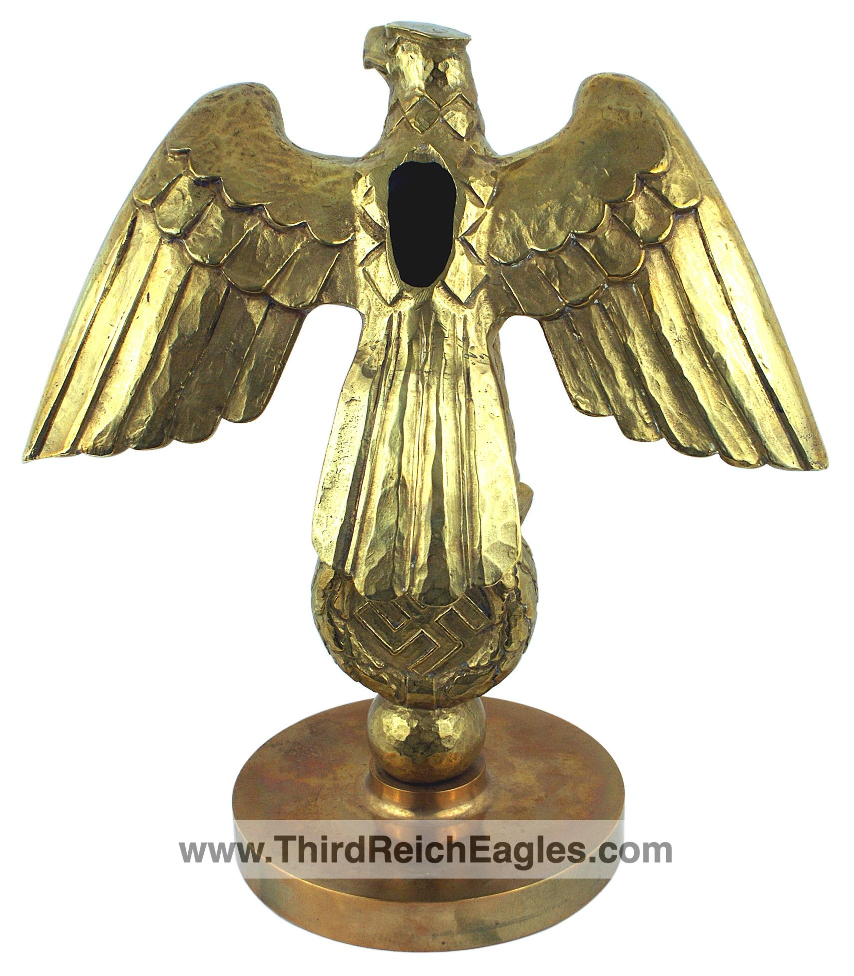Third-Reich custom made gilt-bronze, three dimensional eagle/swastika flag pole stand. 11″ x 12 1/2″ with wings extended at a 45 degree angle. Eagle is perched on a 3 1/2″ diameter swastika on a “hammered” ball and 6 3/4” diameter base. Unusual with an open space on the eagle’s back which can accommodate a flagpole down through the eagle/wreath, round ball, base and pedestal that the eagle would be mounted on.
